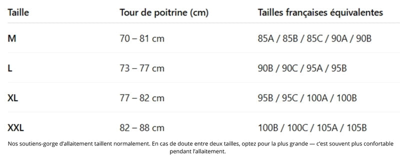 Nous proposons une large gamme de tailles, incluant les grandes tailles, et des bretelles ajustables pour s'adapter parfaitement à votre corps en évolution. Consultez notre guide pour trouver votre match idéal !