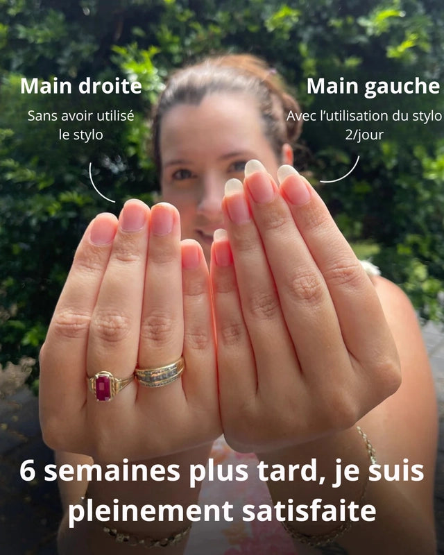 Fini les ongles abîmés ! Révèle enfin des mains dont tu seras fière. Notre stylo est ta solution pour des ongles forts, brillants et sains en juste 2 semaines. Essaie sans risque, ou c'est remboursé. Prête à les montrer ?